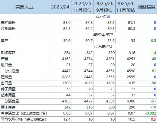 美國2025/26年度大豆單產預估下調為53蒲式耳/英畝,9月預估為53.5蒲式耳/英畝。2024/25年度11月預估為50.7蒲式耳/英畝。2023/24年度預估為50.6蒲式耳/英畝。