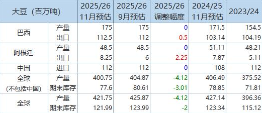 全球2025/26年度大豆產量預估下調為4.2175億噸,9月預估為4.2587億噸。2024/25年度11月預估為4.2714億噸。2023/24年度預估為3.9636億噸。