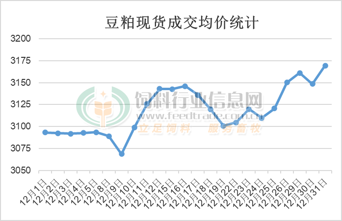 受進口大豆成本跟隨美盤大豆下跌影響,在豆油跟隨進口大豆下跌后,油粕蹺蹺板效應下油廠對豆粕的挺價意愿較強,疊加國內畜禽養殖對豆粕的需求旺季逐漸來臨,豆粕價格仍出現偏強運行走勢,但市場豆粕供應寬松限制其上漲幅度。據飼料行業網豆粕分析師統計,豆粕價格在12月處于震蕩略偏強走勢,高低價差101元/噸,最終12月主要油廠43%蛋白豆粕成交均價3118.2元/噸,較11月均價繼續上漲31.7元/噸,上漲幅度為1.03%。具體分析如下: