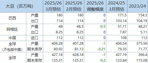 全球2025/26年度大豆產量(除中國)預估下調為4.0628億噸,2月預估為4.0728億噸。2024/25年度3月預估為4.0654億噸。2023/24年度預估為3.7556億噸。