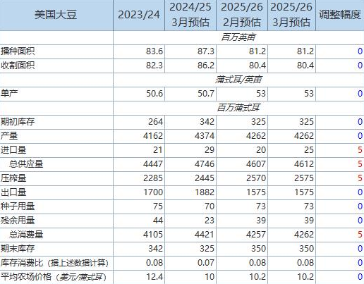 美國2025/26年度大豆期初庫存預估為3.25億蒲式耳,2月預估為3.25億蒲式耳。2024/25年度3月預估為3.42億蒲式耳。2023/24年度預估為2.64億蒲式耳。