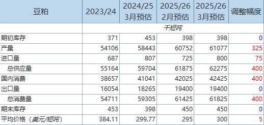美國2025/26年度豆粕年初庫存預估為39.8萬短噸,2月預估為39.8萬短噸。2024/25年度3月預估為45.3萬短噸。2023/24年度為37.1萬短噸。