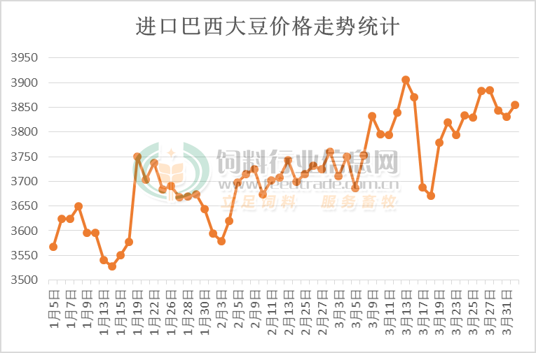 受巴西大豆產區不利于收割的天氣導致大豆上市及出口緩慢,且中東戰亂后原油價格上漲后海運費增加,并帶動豆油等大宗產品上漲后對美盤大豆提供較強支撐,進口大豆成本跟隨上行后增強油廠對豆粕的提價意愿。其中巴西大豆價格上漲明顯,從3月上旬低點3690元/噸強勢上漲至3900元/噸之上,短期漲幅超210元/噸,雖說在后期出現短暫回落,但繼續處于震蕩偏強的走勢。預計后期到港的進口巴西大豆通關數量增多后用于壓榨產生豆粕,供應緊張局面有所緩解后價格將出現偏弱走勢。