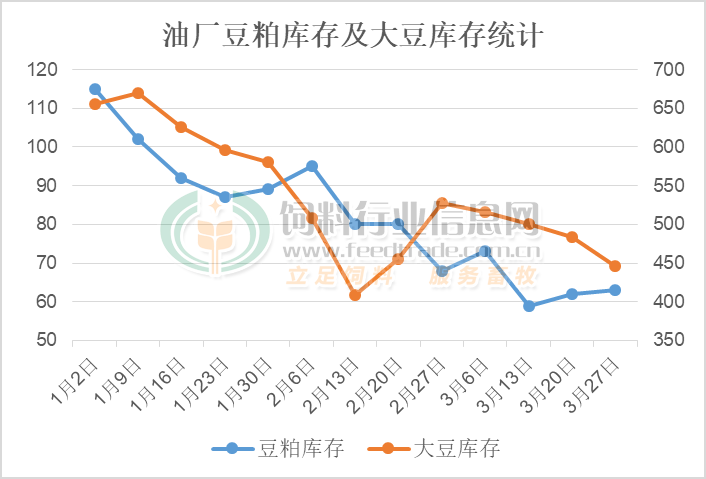 受通關的進口大豆數量較少影響,部分油廠因大豆短缺減產停機等待大豆到廠后才能開工壓榨產生豆粕。雖然生豬及家禽養殖需求逐漸清淡且養殖虧損,但飼料養殖企業剛性需求備貨消耗的豆粕較多,導致油廠豆粕庫存維持在偏低的水平。據國家糧食和物資儲備數據中心監測顯示,截止3月27日,全國主要油廠豆粕庫存63萬噸,繼續處于偏低的水平。不過隨著后期通關大豆數量增多,養殖端對豆粕需求數量將不及油廠豆粕產量,屆時庫存將處于增加的趨勢。