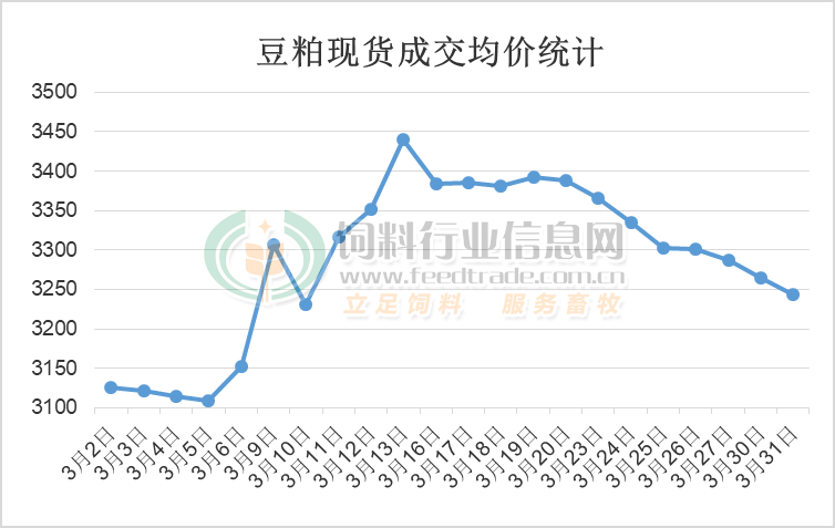 美盤大豆價格上漲且原油漲價后海運費上漲帶動進口大豆價格跟隨上行,疊加到港大豆數量下降后豆粕供應逐漸收緊,增強油廠對豆粕的挺價意愿后價格明顯上行,即使中旬后成本有所回調且預期進口到港大豆數量陸續增加,豆粕價格才出現緩慢回調的趨勢。據飼料行業網豆粕分析師統計,豆粕價格在3月處于偏強運行后緩慢回調走勢,最終主要油廠43%蛋白豆粕成交均價3286.28元/噸,較2月均價上漲近160元/噸,上漲幅度為5.1%。具體分析如下: