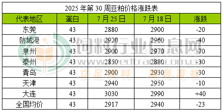 美盤大豆天氣炒作乏力后帶動進口大豆價格下滑,削弱成本端對市場的支撐。國內大豆供應充裕且開機壓榨量較大,豆粕產量較高但出貨數量有限,供應更加寬松。加之政策性下調生豬產能后對豆粕需求或減弱,并持續推進豆粕減量替代等多重利空因素釋放,豆粕價格震蕩偏弱運行。據飼料行業信息網統計數據顯示,沿海地區43%蛋白豆粕價格為2917元/噸,較前一周的2940元/噸下跌23元/噸。在中美關稅未談妥前,國內油廠開機率處于偏高水平,但飼料養殖企業以隨用隨采為主,豆粕市場在供應寬松的情況下或將繼續維持震蕩偏弱運行行情。