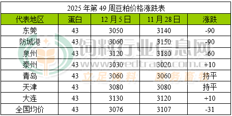 美盤大豆偏弱運行帶動進口大豆價格跟隨下滑,削弱了成本端對市場的支撐。目前進口大豆供應充裕,油廠維持較高的開機壓榨量,豆粕產量較大,而下游飼料養殖企業在價格不溫不火且養殖效益不佳的情況下拿貨謹慎,觀望心理較強,油廠豆粕出貨緩慢后庫存繼續增加,處于偏高水平,供應寬松令油廠挺價乏力,價格維持震蕩偏弱走勢。據飼料行業信息網統計數據顯示,沿海地區43%蛋白豆粕價格為3076元/噸,較上一周下跌31元/噸。雖說氣溫逐漸回落后畜禽養殖對豆粕需求逐漸轉旺,但在豆粕供應寬松預期且養殖效益不佳的情況下,豆粕或將維持震蕩調整行情。