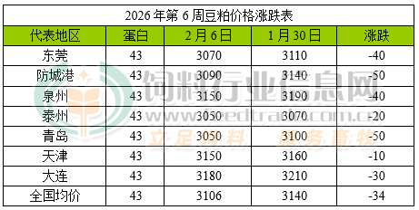 美盤大豆上漲帶動進口大豆成本跟隨上行,不過目前國內油廠大豆供應仍然充裕,在春節停機放假之前油廠壓榨大豆數量一周在220萬噸的較高水平,產生的豆粕數量較大。不過飼料養殖企業備貨基本完畢,繼續提貨數量有限,油廠豆粕出貨放緩后豆粕庫存止降回升,市場購銷清淡且供應寬松令豆粕價格偏弱運行。據飼料行業信息網統計數據顯示,沿海地區43%蛋白豆粕價格為3106元/噸,較上一周下跌34元/噸。隨著大部分工廠陸續停機放假,豆粕產量因開機下降后降至年內低點,但終端拿貨需求也較少,豆粕供應寬松將令價格繼續承壓。