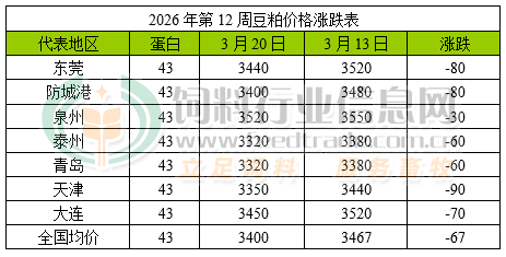 雖然美盤大豆下行削弱成本端對市場支撐,但巴西大豆收割及出口緩慢疊加海運費上漲對市場提供支撐,加之海關加強對進口大豆的昆蟲和雜草檢驗令大豆通關緩慢,油廠大豆逐漸消耗后庫存下降,豆粕庫存也下滑后供應逐漸收緊,增強工廠對豆粕的挺價意愿,在進口巴西大豆大量通關前豆粕價格或維持震蕩偏強行情。據飼料行業信息網統計數據顯示,沿海地區43%蛋白豆粕價格為3400元/噸,較上一周下降67元/噸。隨著部分工廠大豆逐漸減少,且飼料養殖企業有一定的備貨需求后工廠及流通端庫存下降,將支撐豆粕價格維持震蕩調整走勢。