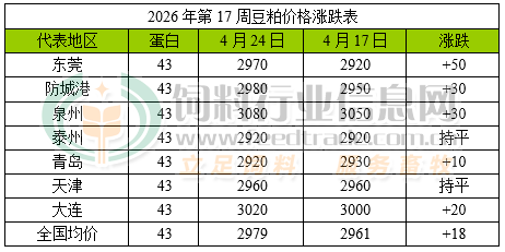 近期雖然到港通關的進口大豆數量逐漸增多,油廠開機率回升后豆粕產量有所增加,但在五一長假前部分飼料養殖企業因剛性需求提貨量增加,豆粕庫存繼續底部震蕩,加之美盤大豆期價上漲后帶動進口大豆成本增加,增強了工廠挺價意愿后價格出現反彈走勢,不過后續供應寬松預期限制其上行幅度。據飼料行業信息網統計數據顯示,沿海地區43%蛋白豆粕價格為2979元/噸,較上一周上行18元/噸。隨著后期到港通關的大豆數量逐漸增加,油廠豆粕產量繼續增大,但飼料養殖企業拿貨需求有限后豆粕庫存將增加,供應逐漸寬松將令價格偏弱運行。