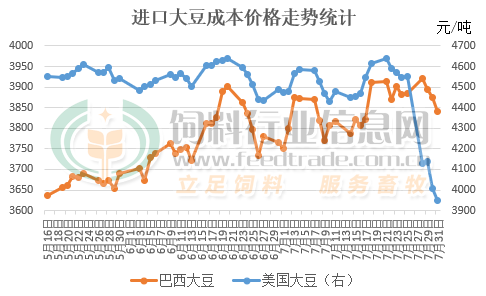 7月27日-29日在斯德哥爾摩舉行的中美代表團第三次會議將兩國之間的關稅休戰期延長三個月,也就是順延至11月12日。從近期進口大豆成本來看,現階段采購的巴西大豆成本雖然出現上行的趨勢,但因目前中國進口美國大豆需加征23%關稅,而巴西及阿根廷等國的大豆加征關稅為3%,即使巴西等國的大豆出現少量溢價的情況下,進口美國大豆成本仍高于南美地區,這令國內進口商在考慮到成本及風險的情況下采購美國大豆意愿依然受限。