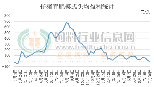 據國家發改委價格監測中心相關數據顯示,截止7月30日當周仔豬育肥模式預期已經虧損3.26元/頭,這是自2024年1月底以來,生豬育肥連續盈利18個月后首次出現虧損,這主要是年后仔豬成本不斷上漲,飼料成本偏高不下加之生豬出欄價格偏弱運行所致。