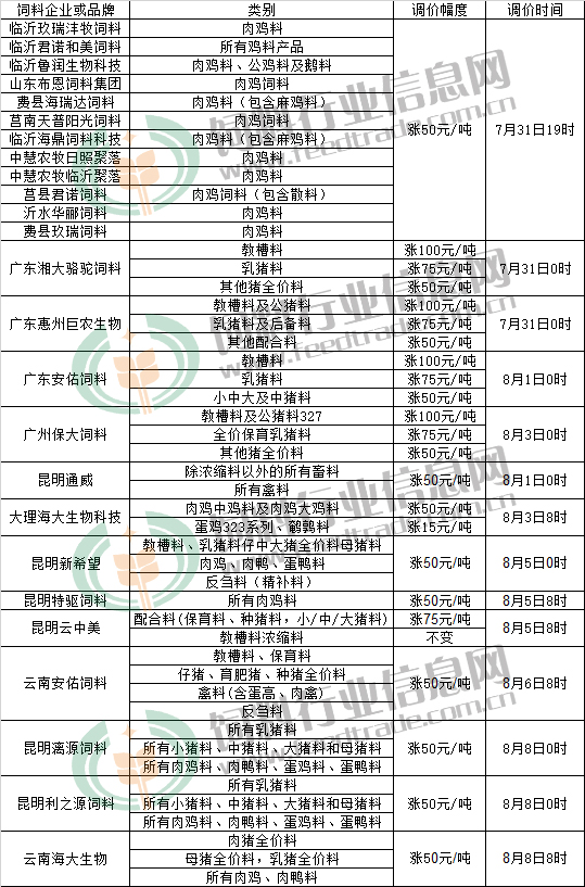 隨著玉米價格不斷上漲,飼料成本出現了一定幅度的增加,加之近期豆粕價格維持偏強走勢且后期存在緊張的擔憂,豆粕價格近弱遠強預期也對飼料成本有明顯的提升,不少飼料企業的大多數全價料價格均出現了上調。山東及廣東的不少飼料企業已經漲價完畢,目前云南不少知名品牌的飼料要么已經漲價完畢,或者就是即將執行漲價,具體如下表所示: