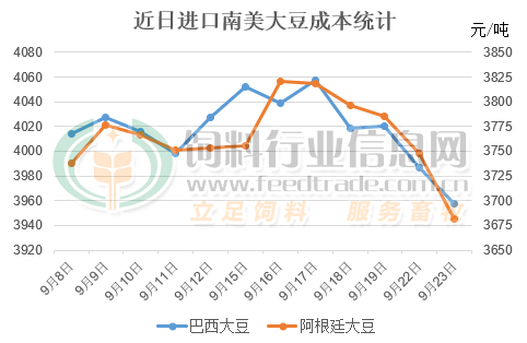 據統計數據顯示,目前中國繼續采購的南美大豆中的巴西大豆及阿根廷大豆,近日跟隨美盤大豆期價一般出現了持續的下行,其中巴西大豆成本下跌100元/噸,阿根廷大豆成本下跌達140元/噸。隨著近期CBOT大豆的持續偏弱運行,預計進口大豆價格繼續處于下跌的趨勢,并削弱成本端對市場的支撐。