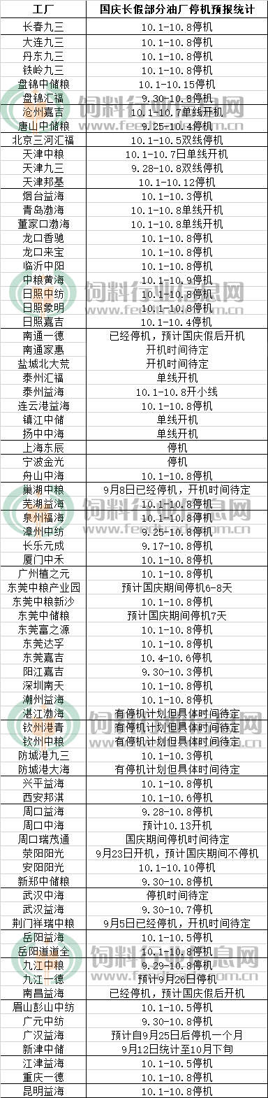 按近期油廠周度壓榨大豆數量維持在230萬噸的情況來看,豆粕產量比較大,9月19日當周主要油廠豆粕庫存也維持在123萬噸的偏高水平,豆粕供應處于寬松格局。隨著國慶中秋長假的臨近,國內大部分工廠均在長假期間進行停機放假。據相關預報顯示,大部分工廠將于10月1日開始停機放假直至10月8日,也有部分工廠會持續開機或者單線開機壓榨,并合理調整自己的停機時間。故在此提醒相關的飼料養殖企業,需要提前備下國慶長假期間的豆粕庫存,以免后期出現斷檔而徒增煩惱。