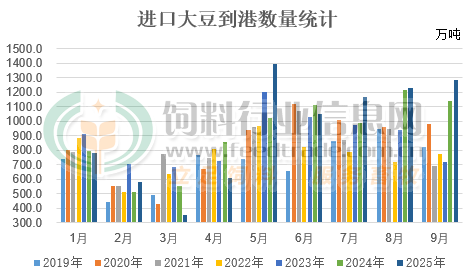 海關數據顯示9月中國大豆進口量達到1286.9萬噸,環比增長4.8%,同比增長13.17%。雖說自6月后中國大豆貿易商因擔憂風險放棄美國大豆的采購轉而購買南美巴西等國的大豆,中國進口的大豆數量自5月來一直保持單月進口數量持續五個月保持在1000萬噸以上的水平,并且9月進口數量再次創下歷史同期最高紀錄,僅次于5月的1391.8萬噸,為單月進口量第二高的水平。2025年1-9月進口大豆數量累積達8618萬噸,較2024年同期增長達5.3%,處于較高的水平。