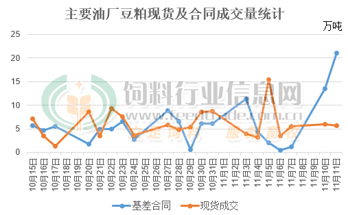 隨著近日氣溫的逐漸下降,國內生豬及家禽養殖對飼料的需求逐漸轉旺,豆粕的消耗需求將逐漸增多。因季節性需求旺季逐漸來臨,疊加偏高的生豬及家禽存欄對飼料剛性需求較大,飼料養殖企業對豆粕的需求逐漸上量,油廠豆粕出貨數量有所增多。