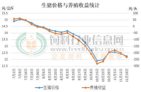 據國家發展和改革委員會價格監測中心公布的數據顯示,11月19日當周全國平均生豬出欄價格為12.24元/公斤,在10月中旬緩慢反彈近一個月后再次重回跌勢,而與生豬價格走勢較為雷同的生豬養殖預期收益持續處于虧損的狀態,目前出欄一頭120公斤的生豬虧損達232.66元。