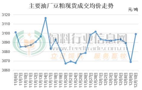 據監測數據顯示,昨日主要油廠 43%蛋白豆粕成交均價在 3100元/噸,較上一個工作日上漲30 元/噸。而今日更是因中國大豆買家繼續購買美國大豆,支撐美盤大豆價格從低點反彈并帶動進口大豆成本出現上漲,增強了對豆粕的提價意愿。相關報價顯示,今日43%蛋白豆粕報價普遍上漲 40-50 元/噸。隨著相關消息持續發酵,加之氣溫下降后畜禽需求逐漸增加,或引發飼料養殖企業備貨積極性,從而繼續支撐豆粕市場維持震蕩偏強行情。