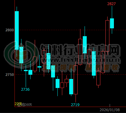 近期豆粕市場在需求逐漸旺季來臨時出現了產量下降的情況,增強了油廠對豆粕的挺價動力,即使供應仍然充裕的情況下價格依然出現了逐步上行的走勢。據飼料行業新希望統計數據顯示,截止1月7日國內主要油廠43%蛋白豆粕現貨成交均價已經上漲至3190元/噸,已將抵達2025年5月8日以來的新高。連盤豆粕主力2605持續四日上漲,今日高開高走,最高達2827元/噸;其它合約也不甘示弱,均出現了不同的漲幅。