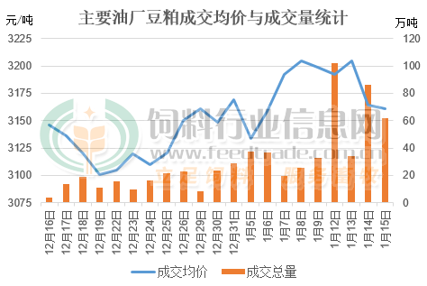 目前離春節還有不到一個月的時間,在這時間段內生豬及肉雞存欄均處于一年中的偏高水平,而牛羊等的育肥工作也持續進行,導致飼料及養殖場對豆粕的需求較大,油廠豆粕出貨數量略高于豆粕產量后,豆粕庫存處于下降的趨勢。據飼料行業網統計,自元旦以來國內油廠豆粕單日成交數量大部分時間都在20萬噸以上的水平,特別是進入中旬以來出現多次成交放量的情況,如此旺盛的市場需求對豆粕價格提供支撐。