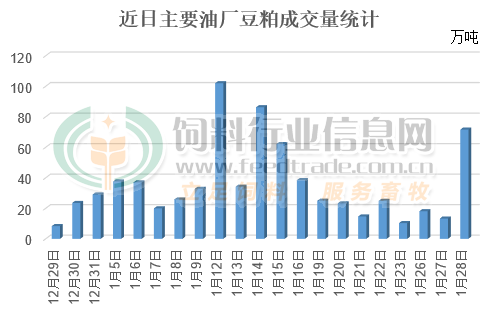 受國內養殖需求旺季期間畜禽養殖的剛性需求較大影響,飼料養殖企業在春節之前拿貨的需求較大,油廠豆粕提貨需求量仍大于油廠壓榨大豆產生的豆粕數量后,油廠豆粕庫存繼續處于減少的趨勢。據國家糧食和物資儲備數據中心監測顯示,截止1月23日,全國主要油廠豆粕庫存87萬噸,已經連續第三周出現下降,減少27萬噸,預計節前拿貨較多油廠庫存將持續下降,增強油廠對豆粕的挺價動力。
