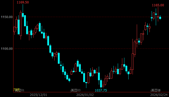 在中國春節長假期間,CBOT大豆期價在阿根廷干旱天氣引發減產擔憂,巴西洪澇疊加中美貿易休戰或延長一年,后美國貿易商向中國出售大量大豆,支撐CBOT大豆期價延續反彈走勢,截止昨夜收盤,CBOT大豆期價主力合約最高達1165美分/蒲式耳,已經漲至11月18日以來高點。
