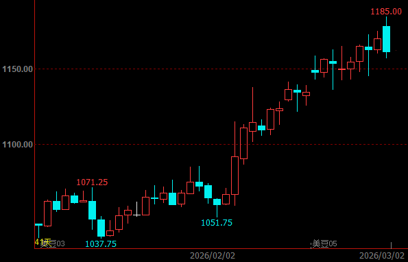 近日美國國內的生物燃料摻混政策有望出臺支撐豆油價格,令美國大豆壓榨需求強勁,加之阿根廷大豆產區干旱引發減產預期,而巴西產區洪澇等災害令大豆收割上市進度放緩,疊加中東地區爆發的美伊戰爭讓全球原油價格飆升,多因素利多美國大豆需求后支撐CBOT大豆期價主力合約最高漲至1185美分/蒲式耳,為2024年6月14日以來高點。