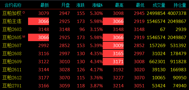 受美盤大豆期價大幅上漲帶動,今日連盤豆粕高開后快速漲停,其中5-9月合約均觸及漲停,截止11:30,豆粕主力2605合約收3066元/噸,上漲173元/噸,漲幅為5.98%,達2025年11月18日以來高點。