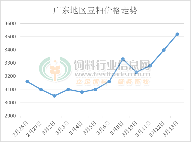 受美國大豆上漲帶動,疊加原油價格上行導致海運費增加,帶動進口大豆成本價格跟隨上行。加之巴西大豆出口銷售緩慢疊加海關加強通關大豆的檢驗檢驗力度后,到港大豆數量不及預期,支撐各地豆粕價格全部出現強勢上漲行情。據統計顯示,目前廣東地區43%蛋白豆粕價格已經漲至3500-3520元/噸,該價格在沿海地區中只低于遼寧及福建地區。