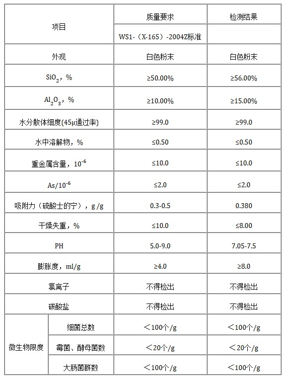 硅膠鑒別為正反應,鋁鹽鑒別為正反應,氯化物≤0.025%,碳酸鹽反應沒有白色沉淀,水中溶解物殘渣≤0.5%,燒失量≤15.0%用X-射線粉末衍射法測定,其中d(001)為15.17-15.22埃,d(300)1.49-1.50埃,