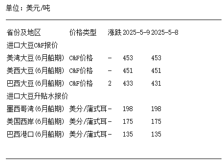 5月9日進口大豆到國內港口C&F及升貼水報價