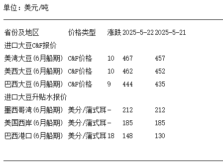 5月22日進口大豆到國內港口C&F及升貼水報價