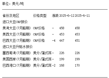 6月12日進口大豆到國內港口C&F及升貼水報價