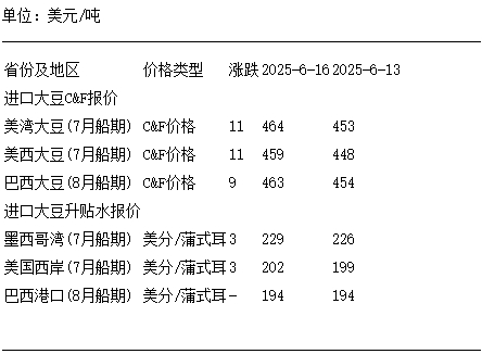 6月16日進口大豆到國內港口C&F及升貼水報價
