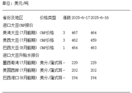 6月17日進口大豆到國內港口C&F及升貼水報價