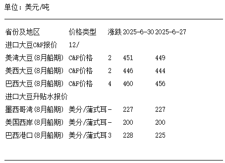 6月30日進口大豆到國內港口C&F及升貼水報價