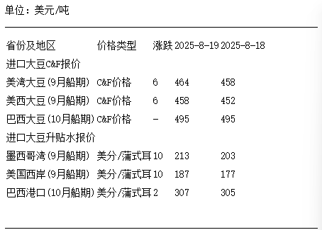 8月19日進口大豆到國內港口C&F及升貼水報價