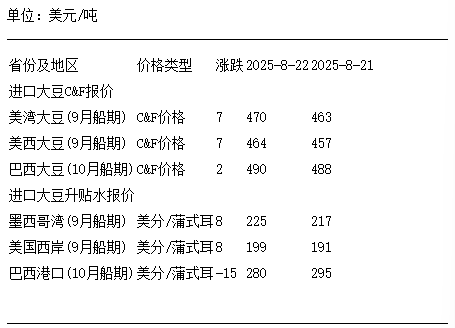 8月22日進口大豆到國內港口C&F及升貼水報價