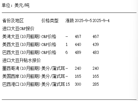 9月5日進口大豆到國內港口C&F及升貼水報價