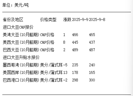 9月9日進口大豆到國內港口C&F及升貼水報價