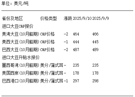 9月10日進口大豆到國內港口C&F及升貼水報價