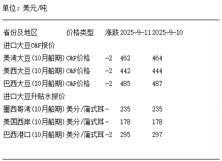 9月11日進口大豆到國內港口C&F及升貼水報價