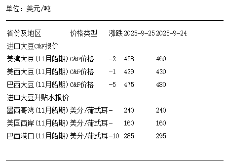 9月25日進口大豆到國內港口C&F及升貼水報價