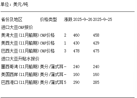 9月26日進口大豆到國內港口C&F及升貼水報價