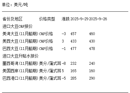 9月29日進口大豆到國內港口C&F及升貼水報價