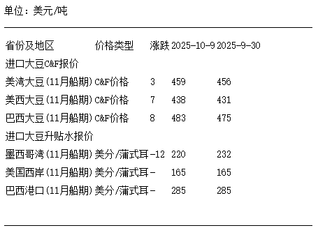 10月9日進口大豆到國內港口C&F及升貼水報價