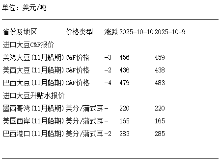 10月10日進口大豆到國內港口C&F及升貼水報價
