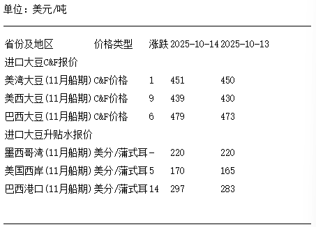 10月14日進口大豆到國內港口C&F及升貼水報價