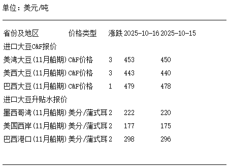 10月16日進口大豆到國內港口C&F及升貼水報價